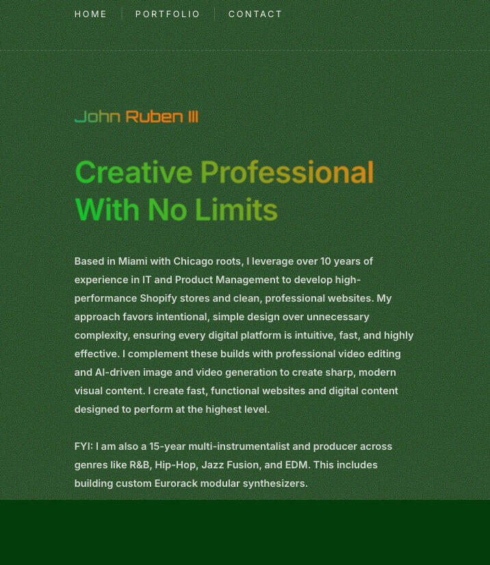 Based in Miami with Chicago roots, I leverage over 13 years of experience in IT and Product Management to develop high-performance Shopify stores and clean, professional websites. My approach favors intentional, simple design over unnecessary complexity, ensuring every digital platform is intuitive, fast, and highly effective. I complement these builds with professional video editing and AI-driven image and video generation to create sharp, modern visual content. I create fast, functional websites and digital content designed to perform at the highest level.FYI: I am also a 15-year multi-instrumentalist and producer across genres like R&B, Hip-Hop, Jazz Fusion, and EDM. This includes building custom Eurorack modular synthesizers.